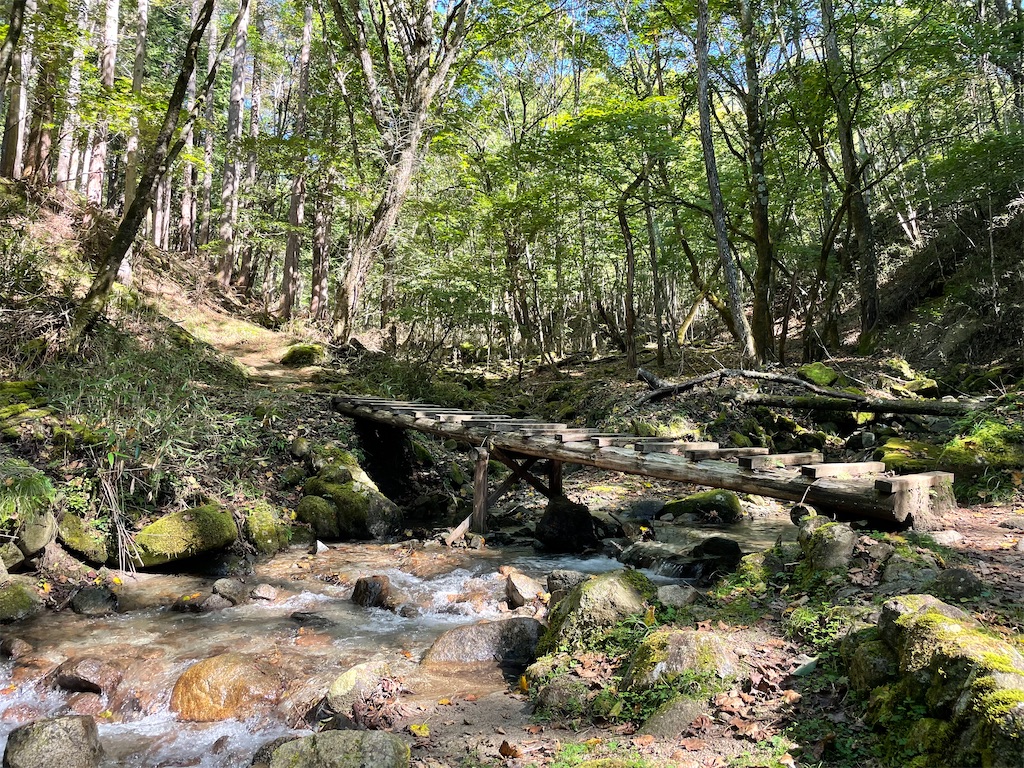 これといった見所はなく、2人でキノコを先に見つけた回数争いをしながら歩いた。ところで去年担いでいた感じより数段重い・・。成長したな。ベビキャリで計20kg以上を担いでの沢歩きは地味に辛いのをいきなり悟った。