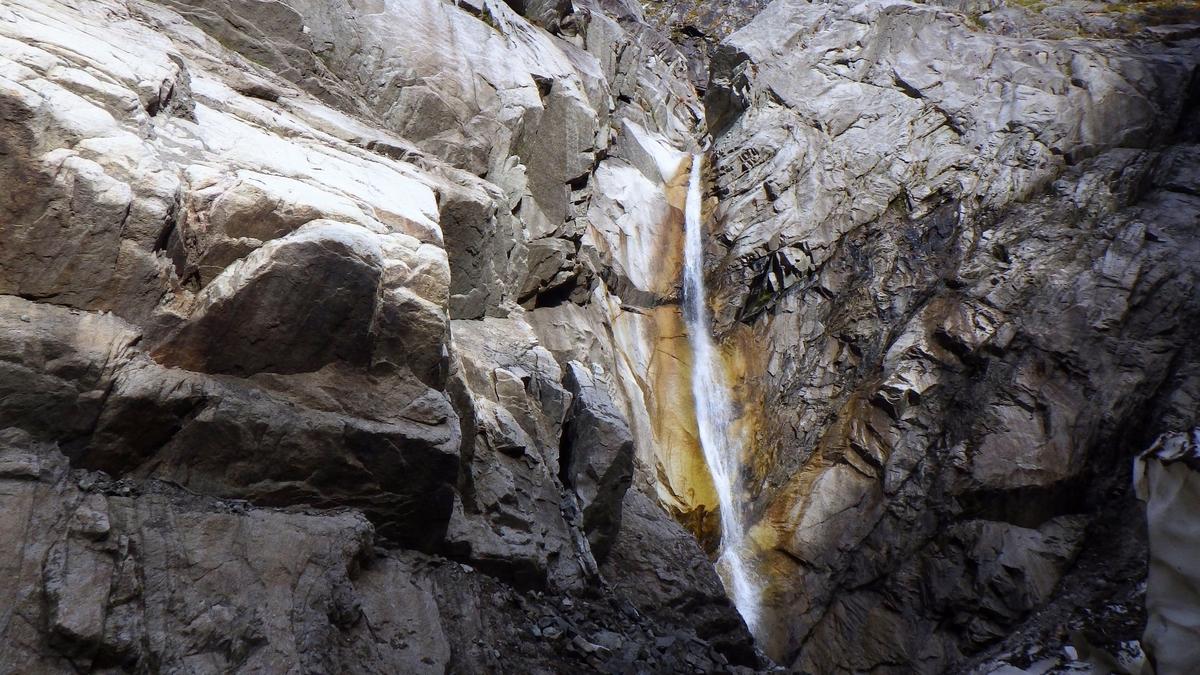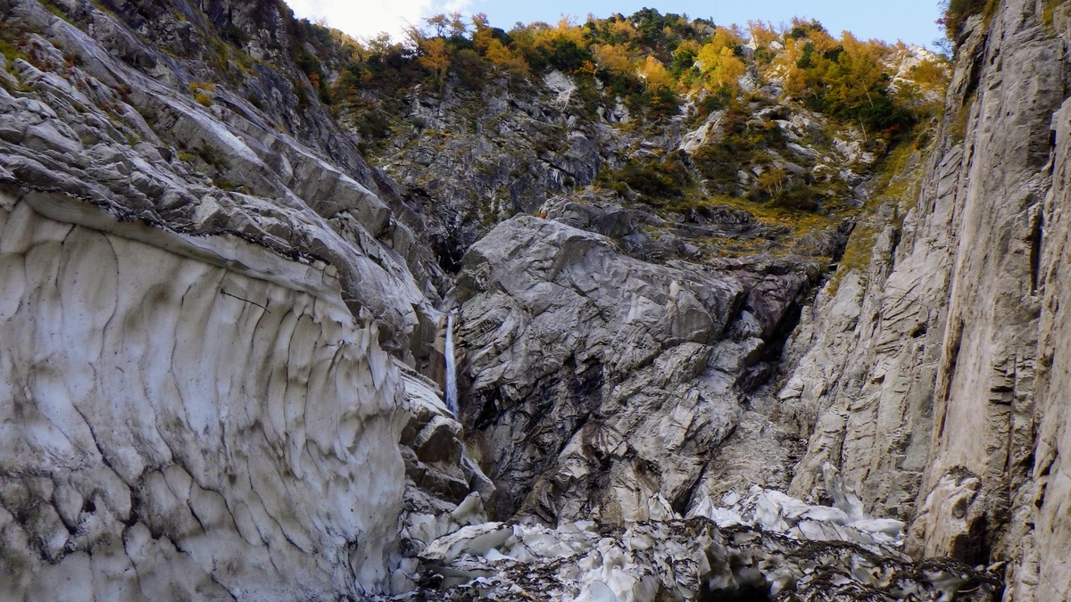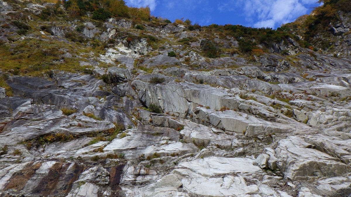陽が差して快晴になる。小一時間ガレを歩き眼前に迫ってきた「前壁」を見やる。広大な前壁を正面にして谷は右に直角に折れる。