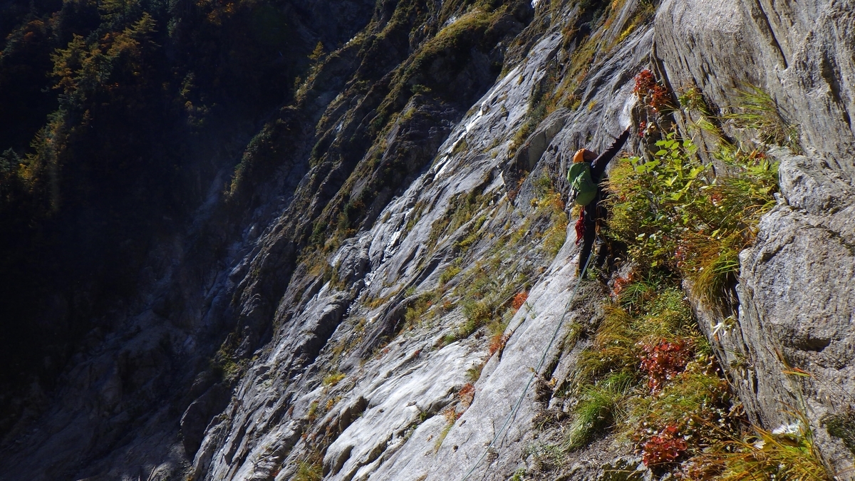 3P、45m。洞穴から右側の傾斜が強めのスラブに出ていく。弾き出されそうな露出感がある。スラブはどスラブで、10m弱ほど上方には明瞭なバンドが通っている。そこまでハーケン一本で、のっぺりした面にわずかに存在する角度が緩いポイントにクライミングシューズをこすり付け、乗り込んでいった。バンドに上がれば、あとはロープほぼいっぱいまでトラバース。残置ボルトで切った。