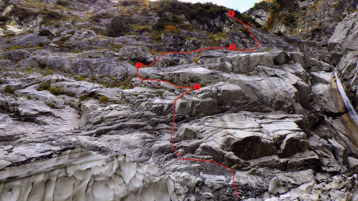 登ったライン。右端にF1が見える。③と④は2点リングボルトの残置だった。これは件の山岳巡礼倶楽部ではない先人が残したと思われた。全体を通じてカムはほとんど使えず、ハーケンが主体になる。「山巡稜」をトレースすることはできなかったが、このおそろしい下又白谷の壁を全身全霊を尽くして攀じることができて、しかも日帰り。大変すばらしい経験ができて、Aさんに心から感謝。