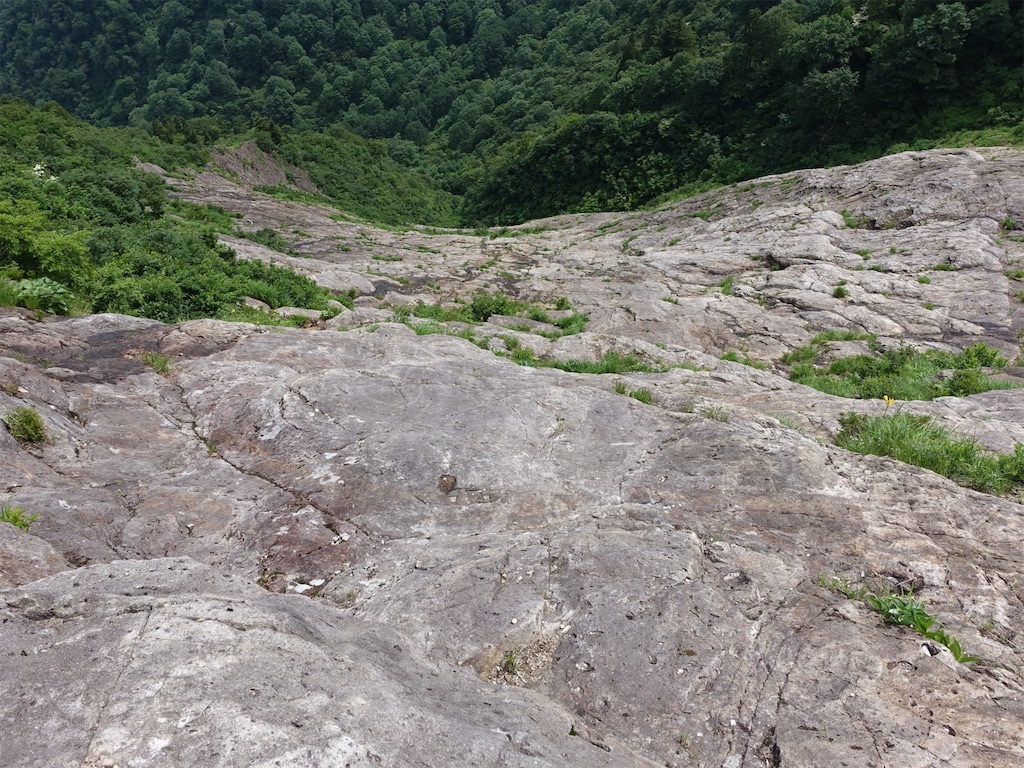 北ノ谷はちゃんとした沢下降だ。藪をつかんで斜面下降していたが、C750mで安全をみて一度懸垂下降。あたりは・・、ごく最近まで雪渓の下でしたという光景。この下降ではあきらかに雪渓処理が核心になる。