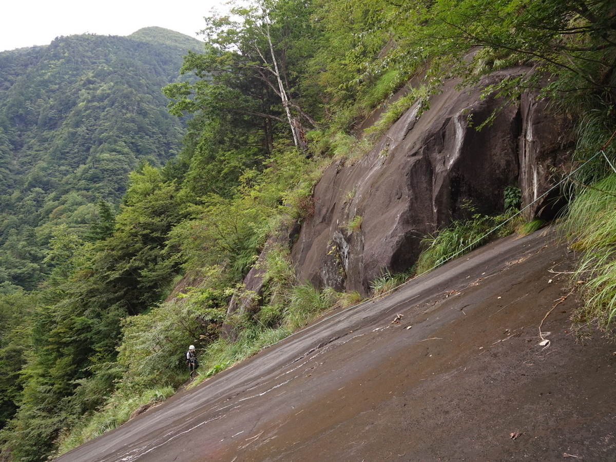 3pはSさん。どうやら正規ライン?と思しきちょい濡れの左上バンドを上がって、木登りから、さらにフレークを持ったスラブを上がっていく。このピッチは山の中のスラブだぜって感じで楽しかった。